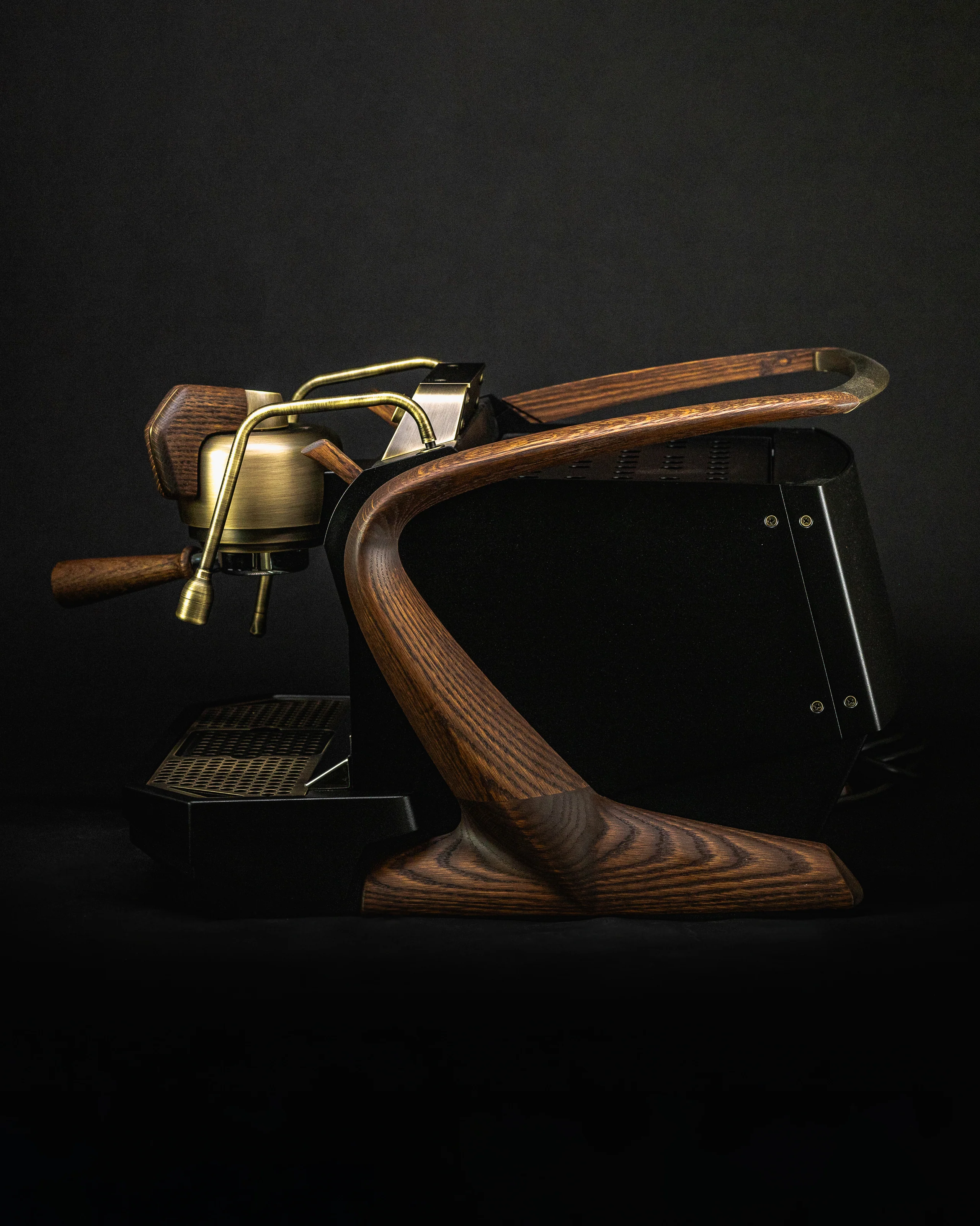 Sweeping, solid aged-oak legs are the dual design highlights. Maintaining the original SLAYER form, the hand-finished wood gracefully meets antique brass to complete the cup rail on the far side of the machine.