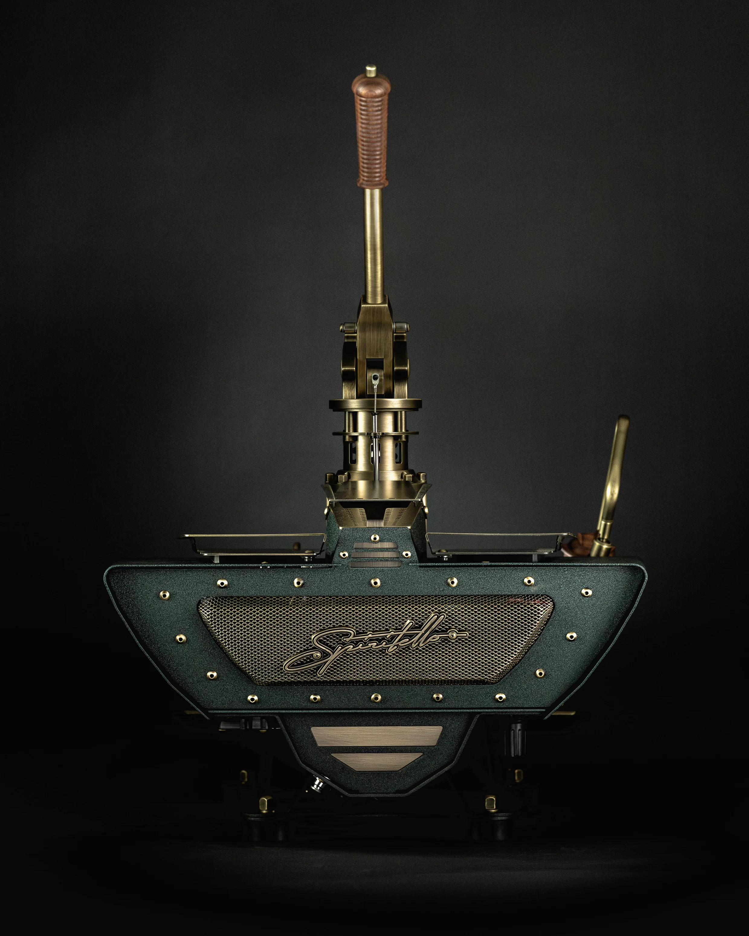 Aged brass is introduced as a bridge between the warmth of walnut and the richness of emerald. Gauge bezels, wands, lever componentry, the drip tray and other select details contribute to the layers of visual complexity.