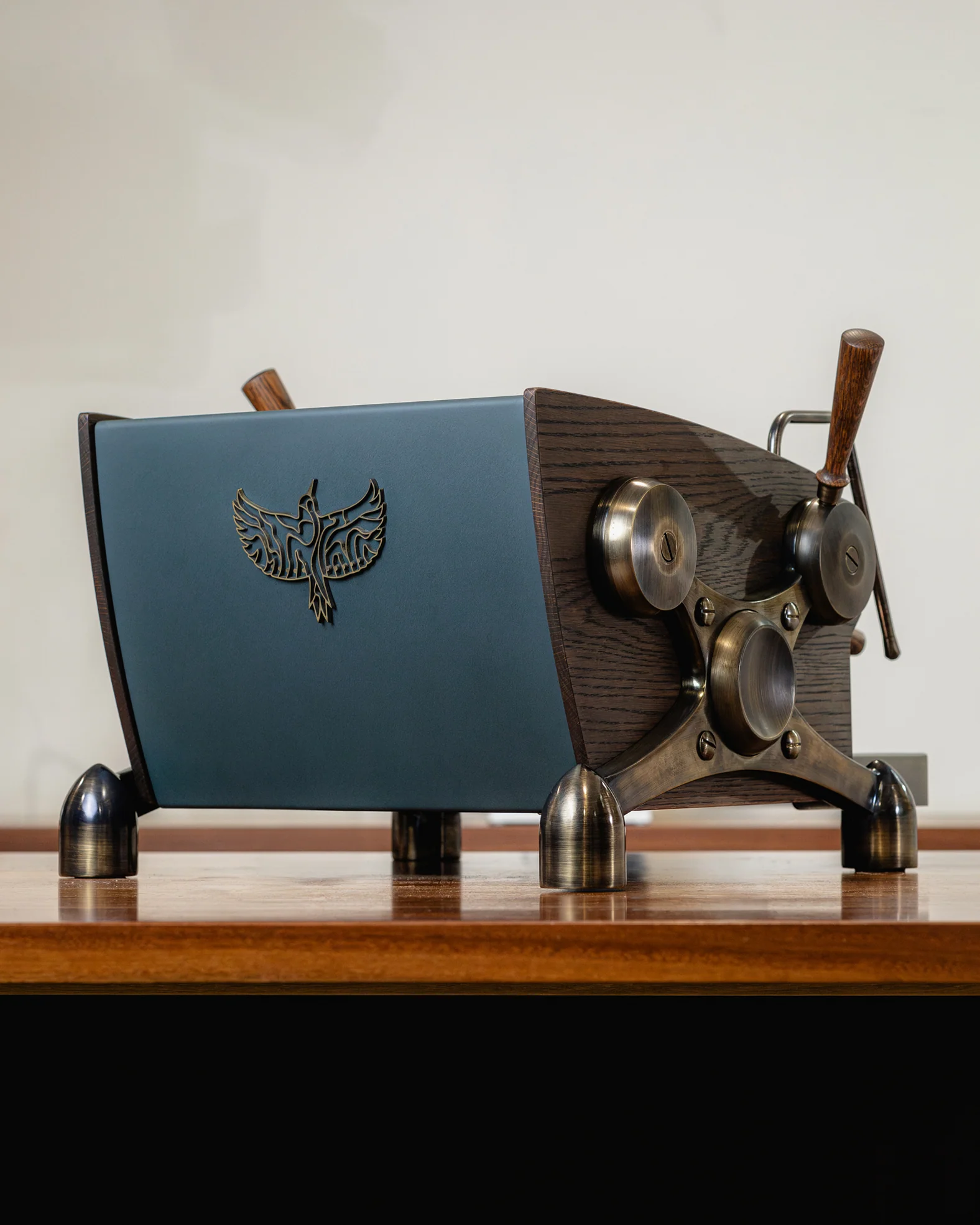 A stunning SLAYER Espresso Single Group home espresso machine, reimagined. The dark, smoked oak touchpoints and matte-finish body color give this Specht its name.