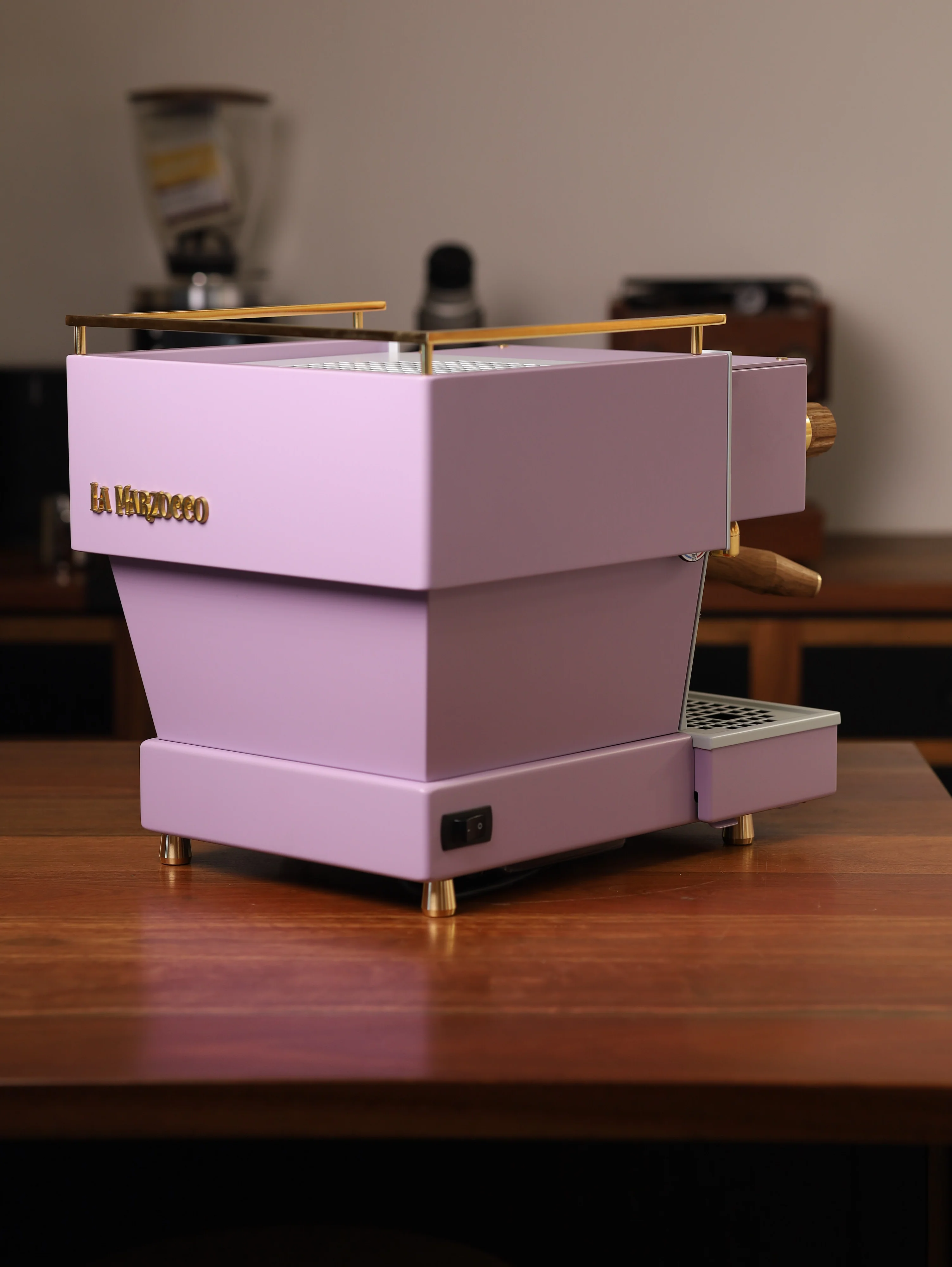 The Sugar Plum is a stunning hand-crafted pink coffee machine with oak touch points and brushed brass highlights, crafted from ethically sourced wood and premium materials.