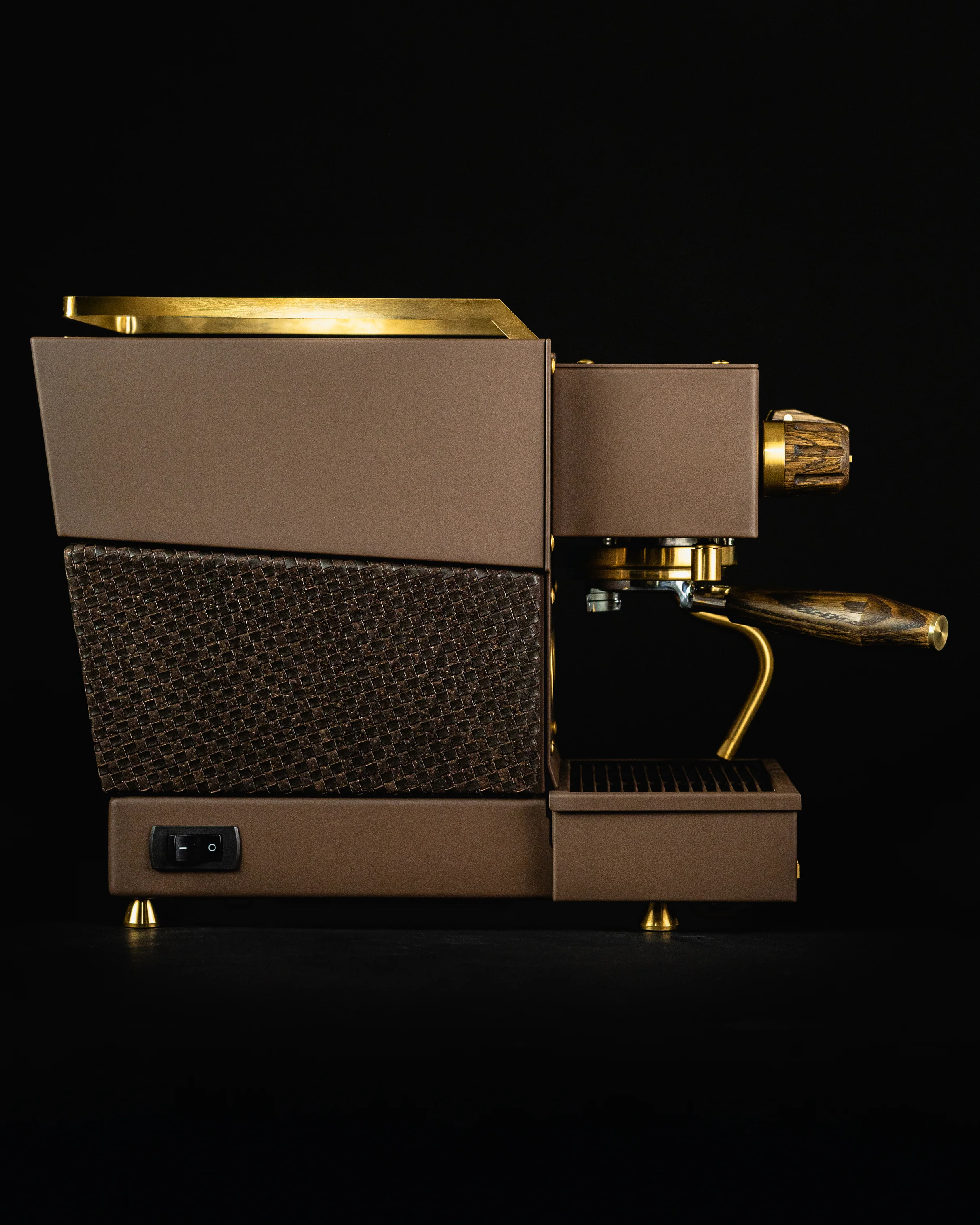 Soft blue gauges offer a moment of visual respite amidst the contrasting brown and gold. Each Woven Leather machine is hand-crafted in our studio in Melbourne, Australia - a city at the heart of international coffee culture.